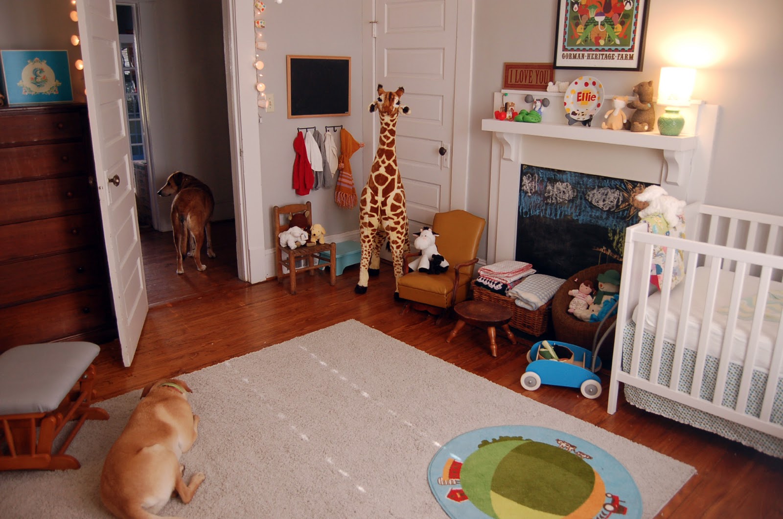 The starting point for this nursery was the vintage curtains that Matt found at a consignment shop. They're actually identical to a set my grandmother had and I can remember sleeping on those sheets as a child. I couldn't resist them and they set the palette for the whole room--bright pops of coral, aqua, yellow, and spring green. This is actually the largest bedroom in our house, perhaps a little large for a nursery, but it adjoins our bedroom so it gives us easy access at night. It was already painted a lovely gray color, so at least we didn't have to repaint! The previous owners also used this room as a nursery and had painted the boarded-up fireplace with chalkboard paint for an improvised drawing space.